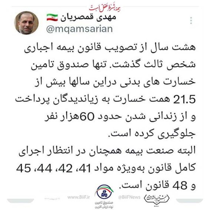 مهدی قمصریان با اشاره به سالگرد تصویب قانون بیمه اجباری شخص ثالث اعلام کرد: در هشت سال گذشته 21.5 همت خسارت پرداخت و از زندانی شدن حدود 60 هزار نفر جلوگیری کردیم.