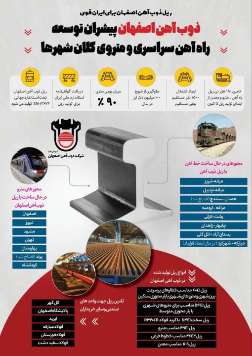 ذوب آهن اصفهان به عنوان تنها تولید کننده ریل در غرب آسیا و همچنین پیشران توسعه راه آهن سراسری و متروی کلان شهرها در سالن 11 – 10 با ارائه سبد متنوع محصولات ریلی نظیر (60E1 مناسب قطارهای پر سرعت بین شهری و متروهای شهری با بار محوری سنگین، (ریل 54E1 مناسب برای متروهای شهری با بار محوری متوسط،( ریل 54E1 با گرید فولاد R320CR از نوع سخت و ضد سایش)، (ریل 49E1 مناسب مترو)، (ریل 46E2 مناسب خطوط فرعی) ، ( ریل 60E1A1 زبانه سوزن) و ( ریل R18 ویژه معدن ) در این نمایشگاه مورد توجه ویژه بازدیدکنندگان قرار گرفته است.