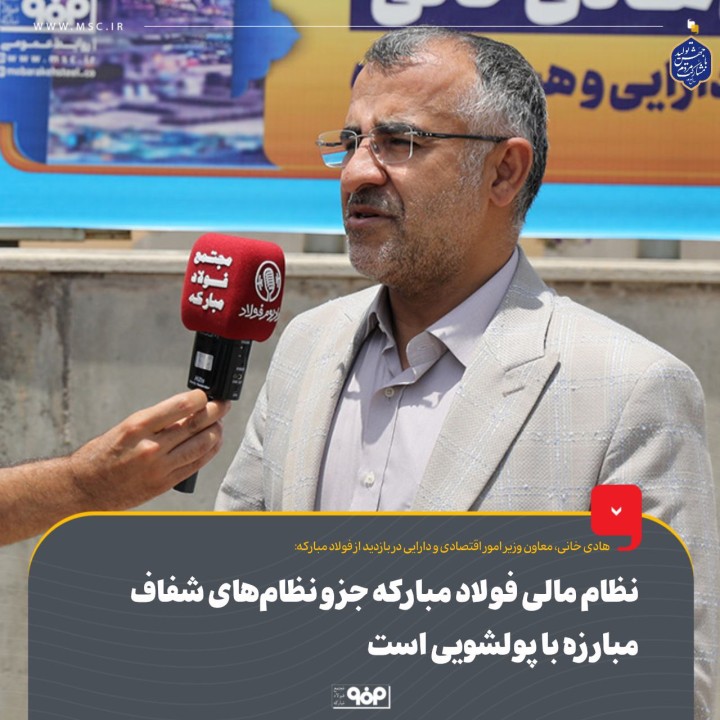 هادی خانی، معاون وزیر امور اقتصادی و دارایی، در بازدید از شرکت فولاد مبارکه اعلام کرد: فولاد مبارکه جزو شرکتهای شفاف و موفق حوزه اقتصادی و مالی در کشور است؛ امروز در این شرکت حاضر شدیم تا واحد مبارزه با پولشویی فولاد مبارکه را راهاندازی کنیم و بتوانیم جریانات مالی آن را رصد کنیم. نظام مالی فولاد مبارکه جزو نظامهای شفاف مبارزه با پولشویی است و تاکنون این شرکت هیچ مورد مشکوکی در حوزه اقتصادی و مالی نداشته است.