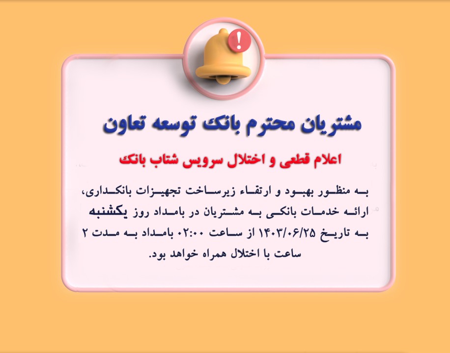 سرویس شتاب بانک توسعه تعاون با قطعی موقت همراه خواهد بود.