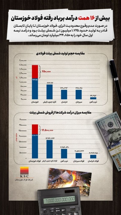 فولاد خوزستان در نیمه اول 1403 در صورت عدم اعمال محدودیت های برق قادر به تولید 1/725 میلیون تن شمش بیلت بود و درآمدش در نیمه اول سال به 34/850 میلیارد تومان می رسید.