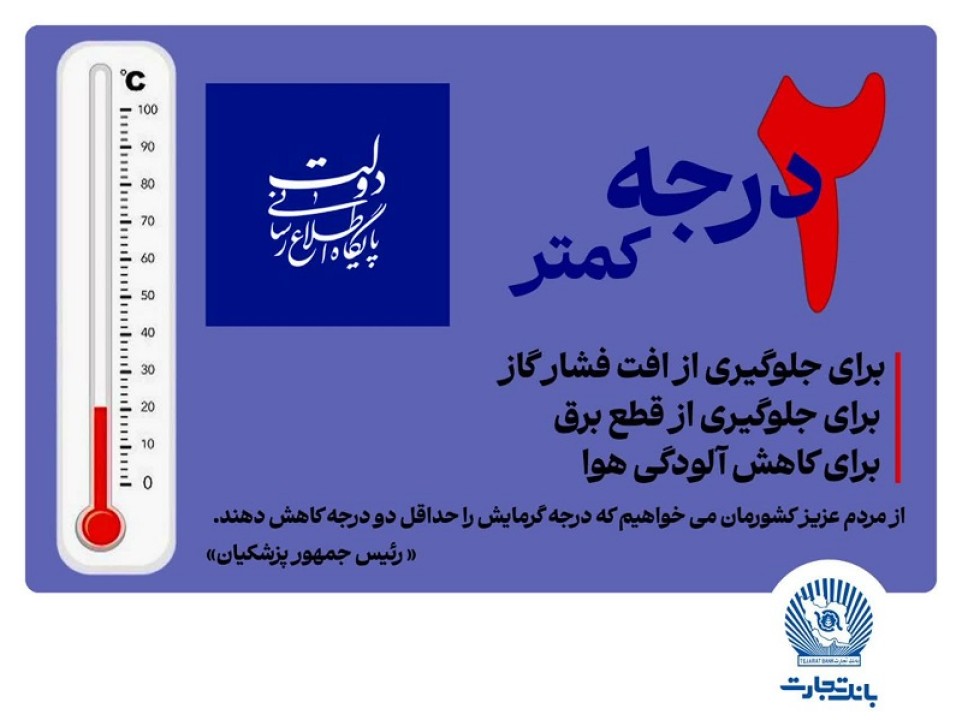بانک تجارت با هدف کاهش آلودگی هوای تهران و کلان شهرهای بزرگ کشور در فصل برودت هوا و صرفه‌جویی در مصرف انرژی، در پویش اجتماعی "دو درجه کمتر" مشارکت فعالانه خواهد داشت.