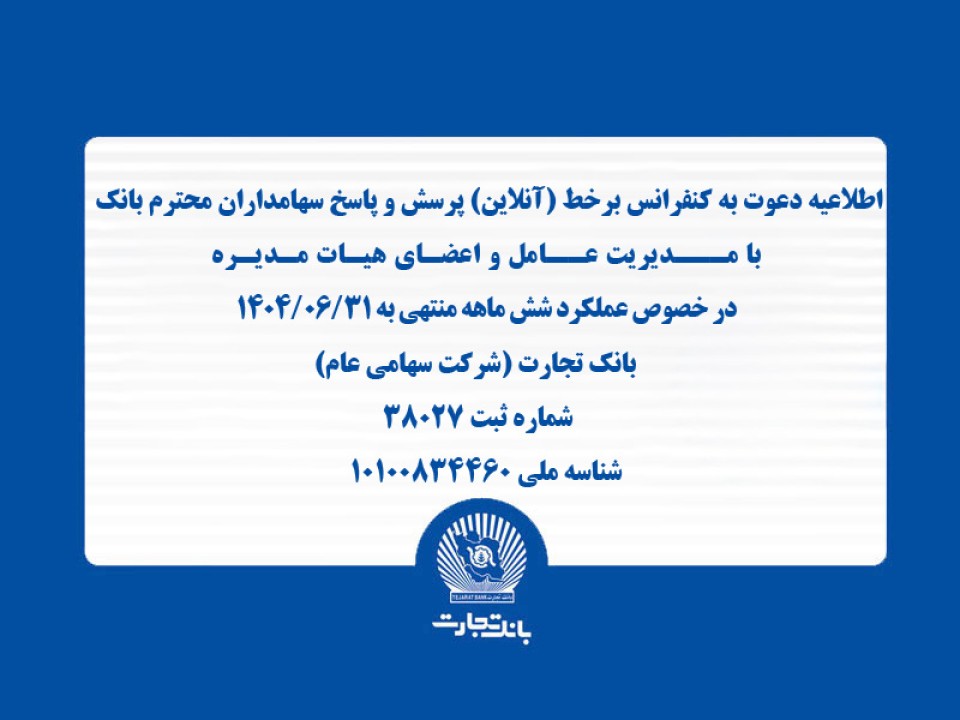 با عنایت به دستورالعمل اجرایی مدیریت نظارت بر ناشران - سازمان بورس و اوراق بهادار به شماره 122/186141 مورخ 1404/08/18؛ بدینوسیله از عموم صاحبان محترم سهام بانک تجارت (سهامی عام) و یا نمایندگان و وکلای قانونی آنها دعوت به عمل می آید تا درجلسه کنفرانس برخط پرسش و پاسخ سهامداران محترم با مدیریت‌عامل و یکی از اعضای هیات‌مدیره بانک که به منظور ارائه گزارش درخصوص عملکرد شش ماهه منتهی به 1404/06/31که رأس ساعت 14روز سه‌شنبه مورخ 1404/09/18 تشکیل می­‌گردد، شرکت نمایند .